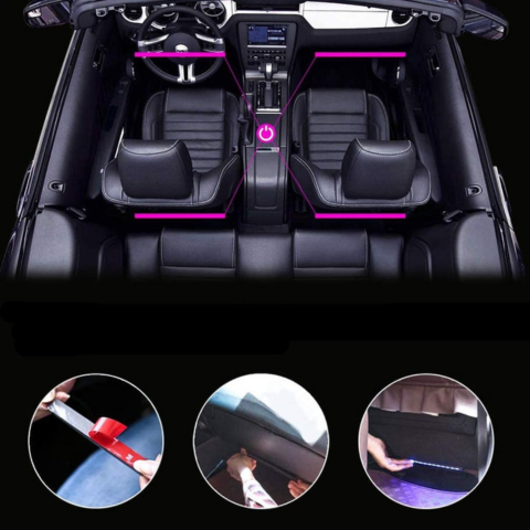 Dette LED-kit forvandler atmosfæren i din bil med multicolor lys, der reagerer på lyd. Kontroller farverne og effekterne via en mobilapp og skab en unik stemning på hver køretur. Hurtig installation og cigarettænderstik inkluderet.